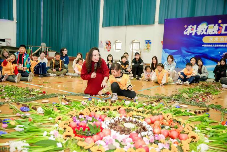 下午在体育馆开展的“大地艺术曼陀罗主题协作创作”,通过艺术治疗共创实践,引导孩子们在团队协作中释放想象力,用色彩与线条表达内心世界。