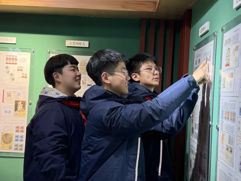 随后,在博物馆专业讲解员的带领下,大家有序参观通史馆、邮票馆等展区。讲解员结合馆藏核心藏品,细致解读特殊教育发展的关键节点,泛黄的史料、承载特教记忆的邮票,让师生们对特教事业的起源与发展有了系统认知。场馆内清晰的指引标识、仿真盲道、贴心的防护道具,既保障了参观秩序,更让大家从细节中感受到特教事业的温度与用心。
