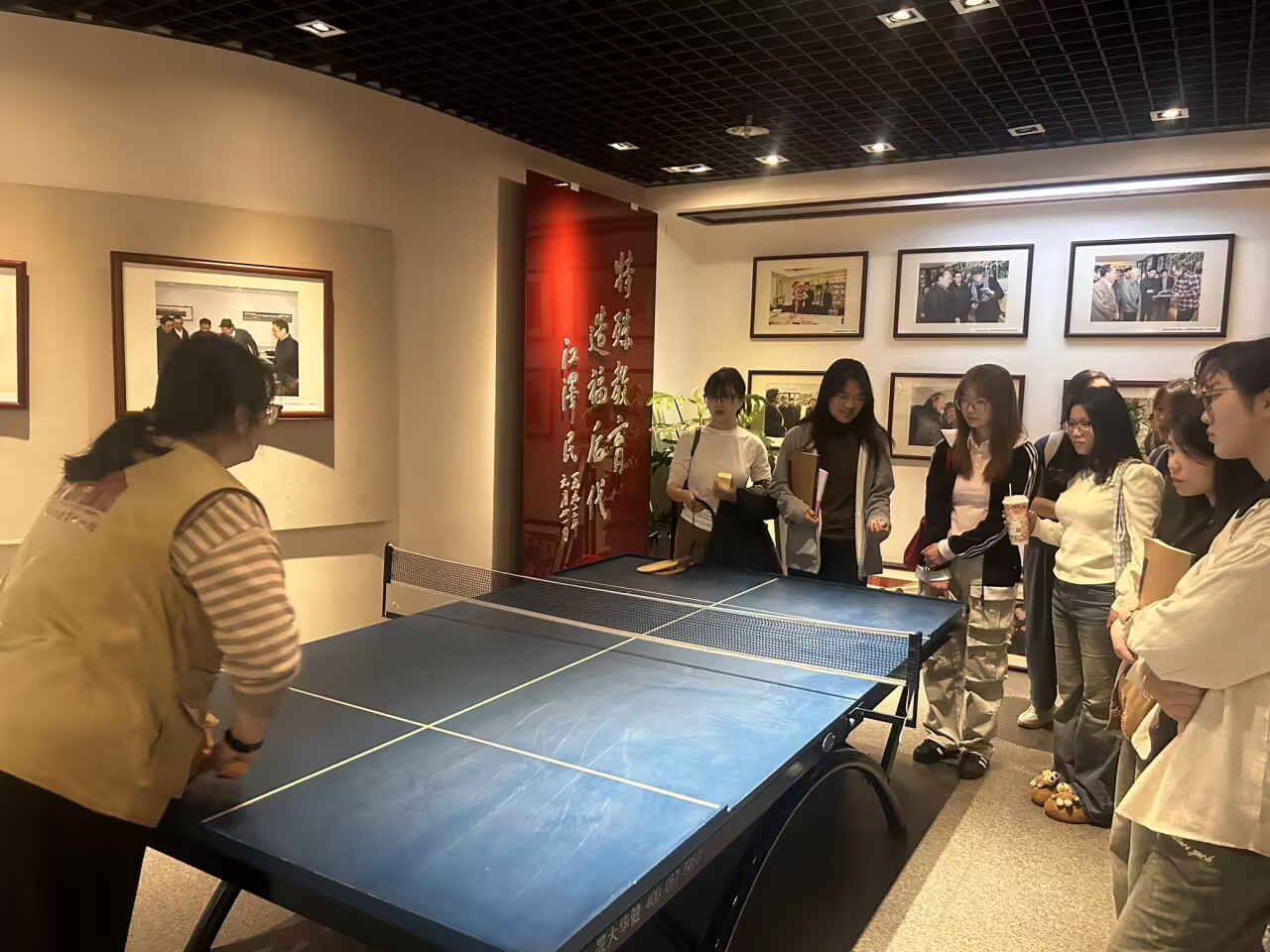 学生志愿者为参观者讲解盲人乒乓球